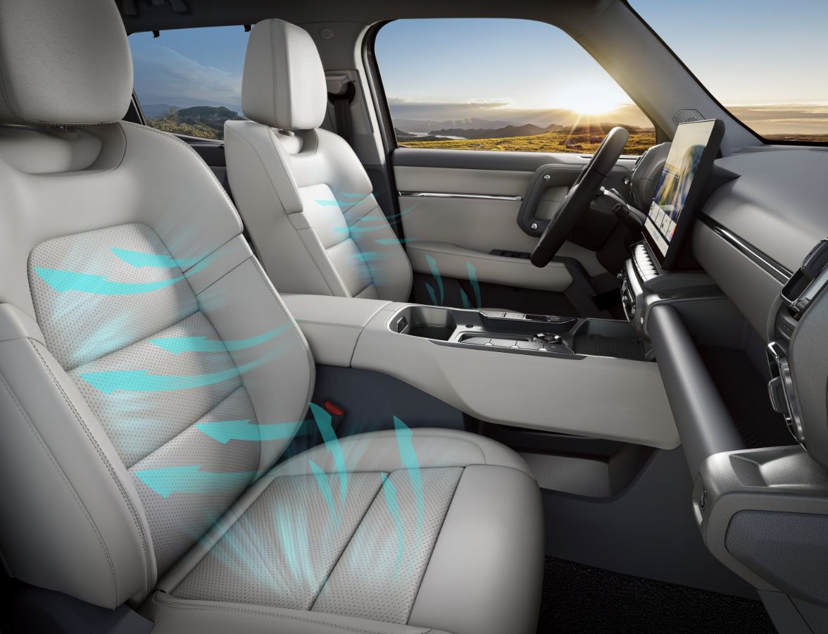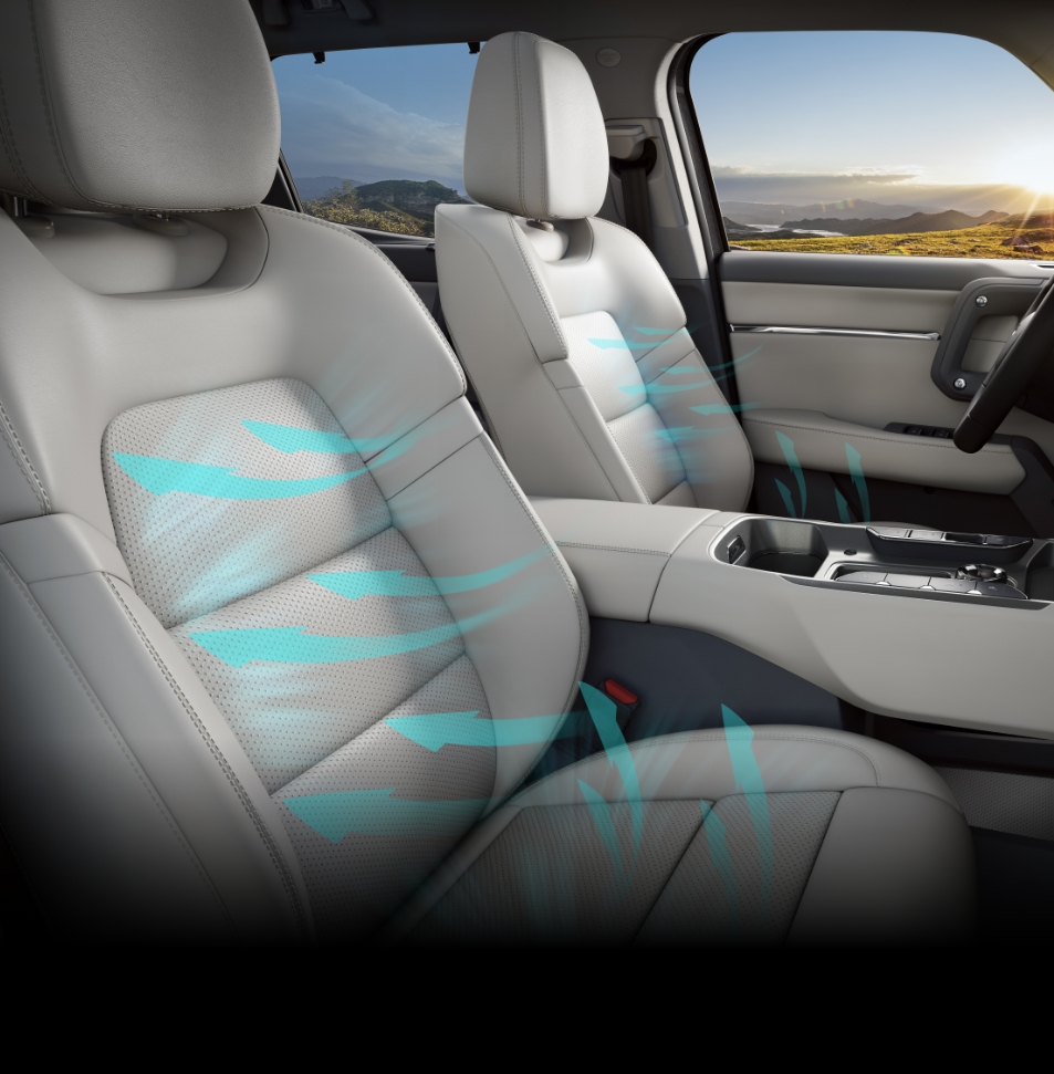 人体工程学座椅,一体式侧翼包覆,主驾8向电动调节;标配前排座椅通风+加热功能,坐垫吹风+靠背吸风,暖心呵护